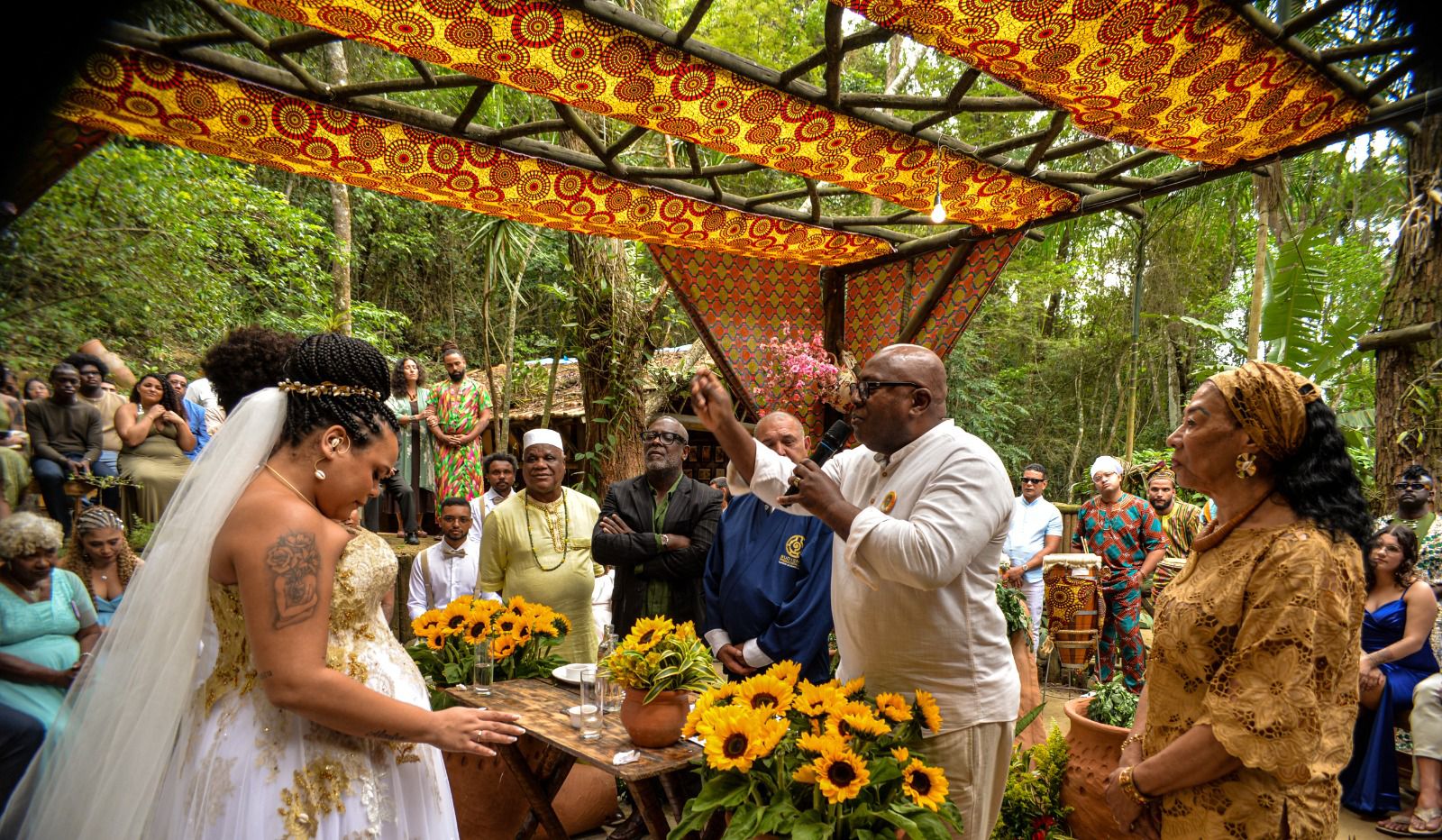 O momento contou ainda com a participação do Babalawô Marcelo Monteiro Ifamakanjuọla Alabi Adedosu, que trouxe a profundidade da tradição yorùbá – “Um casamento yorùbá, ou Ìgbéyàwó, é uma cerimônia rica em rituais que simboliza a união de duas famílias e é abençoada pelos ancestrais e divindades. Inclui a aceitação formal da proposta, a entrega de presentes, a troca de alianças e votos. Há também rituais como as prostrações do noivo, o período de ‘engorda’ para a noiva e a purificação antes de ela entrar na casa do marido. Me coube invocar e reverenciar as forças da natureza e os ancestrais.”