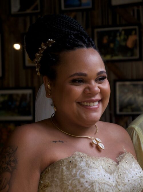 A noiva vestiu um modelo exclusivo da estilista Bia Vaz, inspirado em Oxum e confeccionado em renda Chantilly dourada, com bordados orgânicos e aplicações de búzios, símbolos de proteção e ancestralidade que substituíram as tradicionais pérolas. O noivo, seus padrinhos e o Babalawô Ivanir usaram trajes assinados pelo alfaiate Thiago Soares de Assis, referência em unir sofisticação e identidade. As jóias, da equipe Orian, foram produzidas em prata banhada a ouro com cravações de búzios fizeram sucesso na noiva. O bolo de três andares do Ateliê Carol Guimarães uniu modernidade e tradição, na cor branca e búzios que representavam a força das raízes. E para adoçar ainda mais a celebração, os convidados serão presenteados com os irresistíveis doces do Doce Vício Chocolates. No brinde e na animação da festa, o charme do Luxe Prime Drinkeria, garantindo sabores e experiências únicas até o último momento.