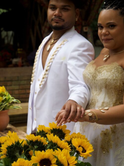 Uma celebração de raízes e futuro, diferente das cerimônias convencionais, não havia tapete vermelho nem marcha nupcial. A condução se deu ao som dos atabaques, dos cantos em iorubá e da energia viva de um quilombo. No ápice da celebração, duas pombas brancas foram soltas como símbolo de paz. Para o cerimonialista Leco Biagioni – “Organizar esse casamento foi uma honra imensa. Em um espaço de resistência e ancestralidade, transforma a cerimônia em algo muito maior do que um rito tradicional. Cada detalhe foi pensado para valorizar a representatividade, a espiritualidade e a história que esse território carrega.”