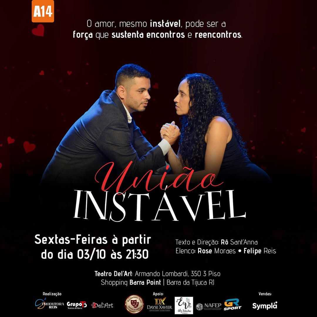 O espetáculo União Instável convida o público a refletir, rir e se emocionar com as complexidades das relações amorosas, interpretado pelos atores Rose Moraes e Felipe Reis, texto e direção de Rô Sant´Anna. A trama mergulha nos altos e baixos da vida a dois, explorando os desgastes do cotidiano, os conflitos inevitáveis e, sobretudo, a possibilidade de recomeçar.