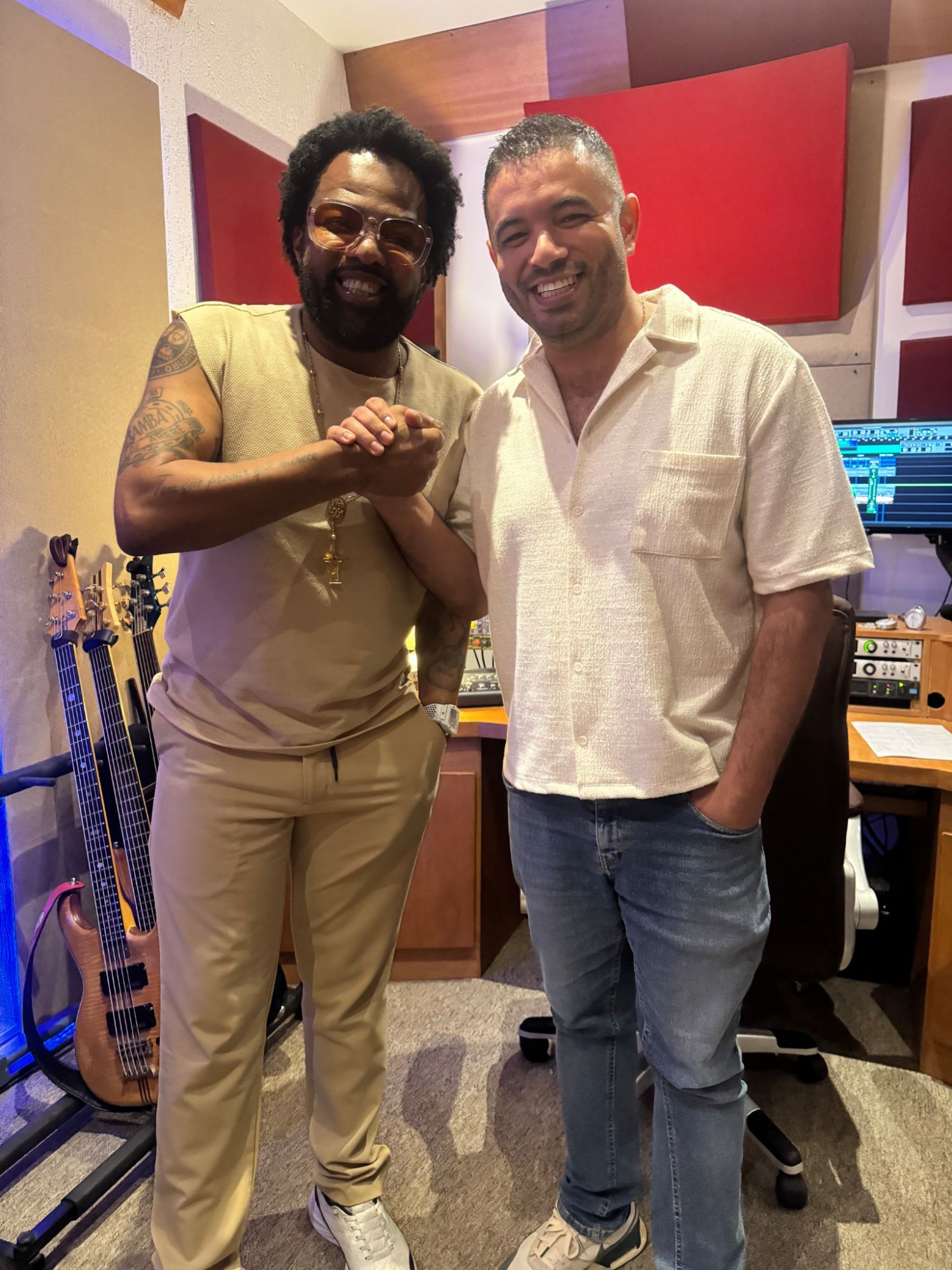 Xande de Pilares e Felipe Reis posam no estúdio, depois de gravarem a canção inédita “Eram dois ou mais”, de Paulo César Feital e Cláudio Azeredo.